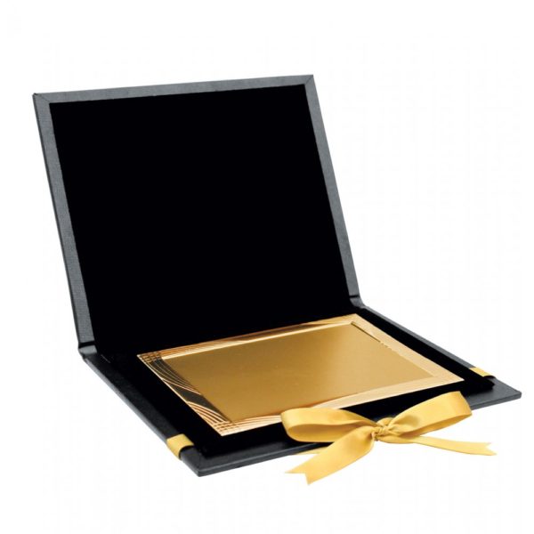 Estojo tipo pasta em couro preto para placas de 18cm X 13cm. Interior em veludo preto e fita em cetim na cor dourada.
