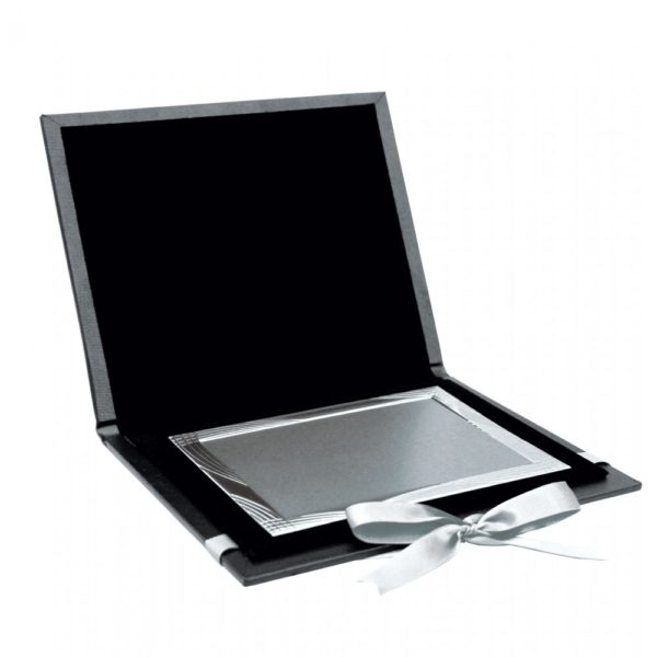 Estojo tipo pasta em couro preto para placas de 18cm X 13cm. Interior em veludo preto e fita em cetim na cor prata.