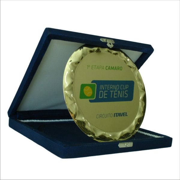 Placa redonda em alumínio na cor dourada com detalhes em alto relevo na cor dourada brilhante. Gravação em sublimação colorida sem relevos. Tamanho: 18cm de diâmetro. Disponível também na cor dourada.