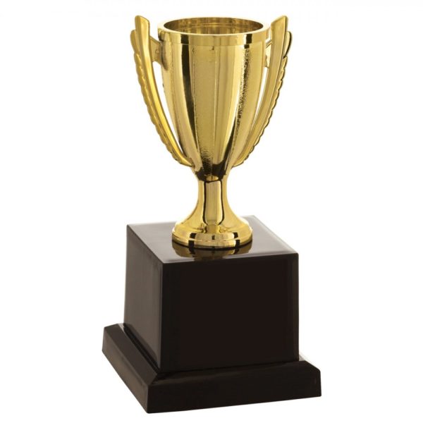 Troféu com a altura de 16 cm, base quadrada com 7,50 cm de largura em polímero na cor preta, taça aberta em polímero metalizado na cor dourada ou prateda com 7,10 cm de largura entre as alças.