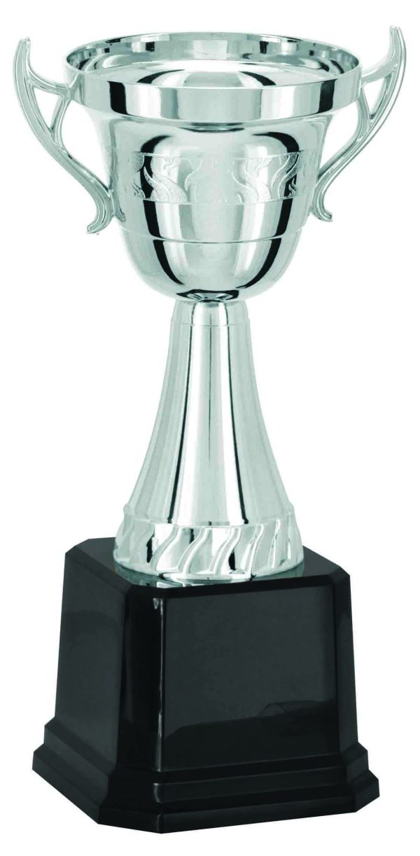 Taça aberta com 31cm de altura e 10cm de largura, a partir das alças. Base em polímero na cor preta. Acompanha gravação em plaqueta de alumínio na base.