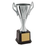 Troféu com altura de 40 cm, base oitavada com 14,5 cm de largura em polímero na cor preta. Sobre esta base uma taça em polímero com detalhes com 21,0 cm de largura em as alças metalizada na cor prata com pintura interna prata metálica.