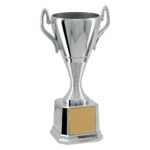 Troféu com altura de 61 cm, base oitavada com 14,5 cm de largura em polímero metalizado na cor prata. Sobre esta base uma taça em polímero com detalhes com 21,0 cm de largura em as alças metalizada na cor prata com pintura interna prata metálica. Acompanha gravação em adesivo personalizável.
