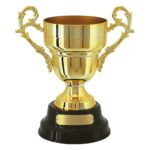 Troféu com 36 cm de altura, base redonda com 21 cm de largura em polímero na cor preta. Sobre esta base um suporte metalizado na cor dourada e um anel metalizado na cor prata. Taça aberta com 33 cm de largura a partir das alças metalizada na cor dourada.