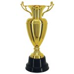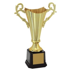 Taça em metal com 60cm de altura. Disponível nas cores ouro e prata. Base em polímero na cor preta. Acompanha gravação em plaqueta de alumínio na base.
