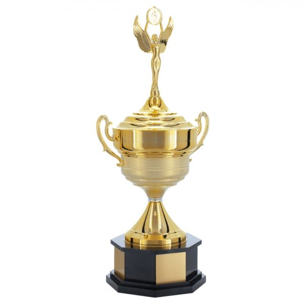 Taça em polímero na cor dourada / dourado fosco, com 104cm de altura, indicado para premiações transitórias. Base em mdf na cor preta. Acompanha 5 plaquetas para gravação. Estatueta em polímero Vitória (pode utilizar estatuetas de outras modalidades).