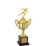 Troféu com altura de 33 cm, base quadrada com 7,5 cm de largura em polímero na cor preta. Cone com detalhes em polímero metalizado na cor dourada, taça em polímero metalizado na cor dourada com 12,5 cm de largura a partir das alças. Tampa em polímero metalizado na cor dourada. Estatueta intercambiável de Atletismo Feminino.