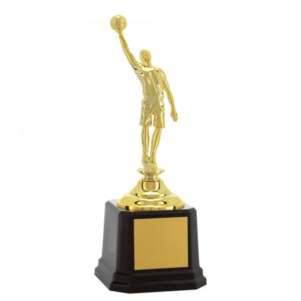Troféu com altura de 32 cm, com suporte metalizado na cor dourada. Base oitavada com 12,10 cm de largura em polímero na cor preta. Plaqueta para gravação. Estatueta de jogador de basquete em polímero na cor dourada.