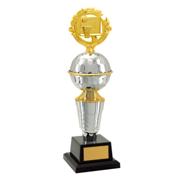 Troféu com altura de 40 cm, base quadrada com 11 cm de largura em polímero na cor preta. Sobre esta base um cone com detalhes em polímero metalizado na cor prata com uma tampa metalizada na cor dourada. Sobre esta tampa uma bola lapidada em polímero metalizada na cor prata intercalada por um anel em polímero metalizado na cor dourada. Estatueta superior intercambiável de Ramo com Basquete. Acompanha gravação personalizável em adesivo.