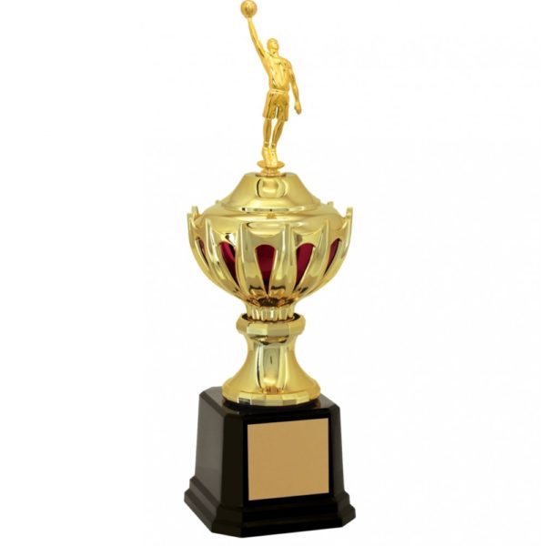 Troféu com 43 cm de altura, com base com 12,1 cm de largura em polímero na cor preto. Na parte superior desta base um cone em polímero metalizado na cor dourado e sobre este cone uma coroa em polímero com 12 pontas com 13,3 cm de largura metalizada na cor dourada, com uma copa interna em polímero metalizada na cor veremelha e uma tampa em polímero metalizada na cor dourado. Estatueta intercambiável de Basquete.