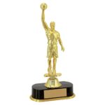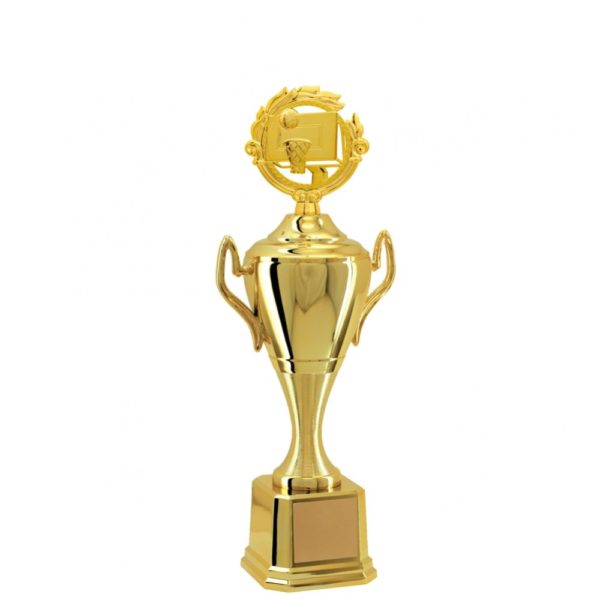 Troféu com altura de 52 cm, base oitavada com 12,1 cm de largura em polímero metalizado na cor dourada. Sobre esta base uma taça em polímero com detalhes com 18,5 cm de largura em as alças metalizada na cor dourada, com uma tampa metalizada na cor dourada. Estatueta superior intercambiável de ramo com Basquete. Acompanha gravação personalizável em adesivo.