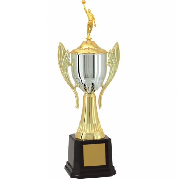 Troféu com 69 cm de altura, com base oitavada com 17,5 cm de largura em polímero na cor preta. Cone em polímero com detalhes na parte inferior metalizado na cor dourada. Copa em polímero metalizado na cor prata com 24 cm de largura entre as alças. Tampa e alças em polímero metalizado na dor dourada. Estatueta intercambiável de Basquete.
