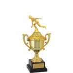 Troféu com altura de 30 cm, base quadrada com 7,5 cm de largura em polímero na cor preta. Cone com detalhes em polímero metalizado na cor dourada, taça em polímero metalizado na cor dourada com 12,5 cm de largura a partir das alças. Tampa em polímero metalizado na cor dourada. Estatueta intercambiável de Bocha.