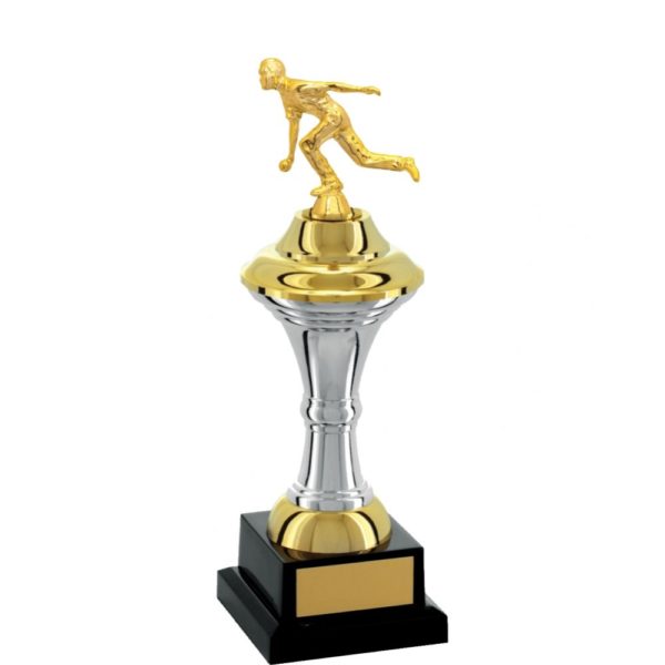 Troféu com 31 cm de altura, com base quadrada com 7,5 cm de largura em polímero na cor preta, sobre esta base um suporte e dois cones com detalhes em polímero metalizado na cor prata. Sobre estes cones um suporte em polímero metalizado na cor dourada. Estatueta intercambiável Bocha.