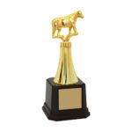 Troféu com altura de 27 cm, com base octogonal com 8,5 cm de largura em polímero na cor preta. Cone com frisos em polímero metalizado na cor dourada. Estatueta intercambiável de Boi/VacaAcompanha gravação personalizável em adesivo.