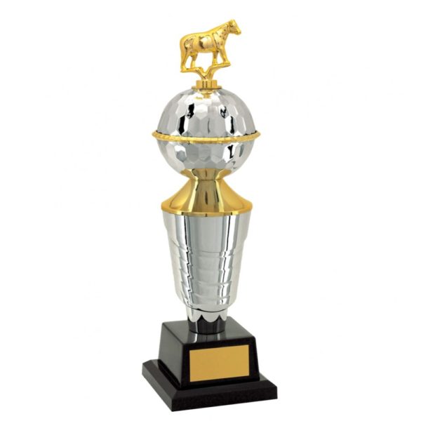 Troféu com altura de 49 cm, base quadrada com 11 cm de largura em polímero na cor preta. Sobre esta base um cone com detalhes em polímero metalizado na cor prata com uma tampa metalizada na cor dourada. Sobre esta tampa uma bola lapidada em polímero metalizada na cor prata intercalada por um anel em polímero metalizado na cor dourada. Estatueta superior intercambiável de  Boi/Vaca. Acompanha gravação personalizável em adesivo.