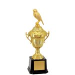Troféu com altura de 31 cm, com base octogonal com 7,3 cm de largura em polímero na cor preta. Cone com detalhes em polímero metalizado na cor dourada, taça em polímero metalizada na cor dourada com detalhes texturizados e 9 cm de largura a partir das alças. Tampa em polímero metalizado na cor dourada. Estatueta intercambiável de Canário. Acompanha gravação personalizável em adesivo.