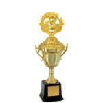 Troféu com altura de 40 cm, com base octogonal com 8,5 cm de largura em polímero na cor preta. Cone com detalhes em polímero metalizado na cor dourada, taça em polímero metalizada na cor dourada com detalhes texturizados e 13 cm de largura a partir das alças. Tampa em polímero metalizado na cor dourada. Estatueta intercambiável de Ramo com Ciclismo/Bike. Acompanha gravação personalizável em adesivo.