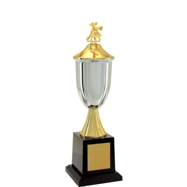 Troféu com altura de 53 cm, base quadrada com 13 cm de largura em polímero na cor preta. Sobre esta base um cone metalizado na cor dourada e uma taça metalizada na cor prata, com uma tampa metalizada na cor dourada, com 10,5 cm de largura, Estatueta superior intercambiável de Balé / Dança.