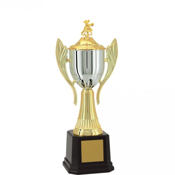 Troféu com 69 cm de altura, com base oitavada com 17,5 cm de largura em polímero na cor preta. Cone em polímero com detalhes na parte inferior metalizado na cor dourada. Copa em polímero metalizado na cor dourada com 24 cm de largura entre as alças. Tampa e alças em polímero metalizado na dor dourada. Estatueta intercambiável de Dança.