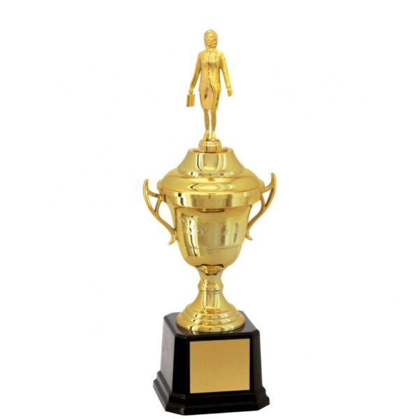 Troféu com altura de 31 cm, com base octogonal com 7,3 cm de largura em polímero na cor preta. Cone com detalhes em polímero metalizado na cor dourada, taça em polímero metalizada na cor dourada com detalhes texturizados e 9 cm de largura a partir das alças. Tampa em polímero metalizado na cor dourada. Estatueta intercambiável de Executiva. Acompanha gravação personalizável em adesivo.