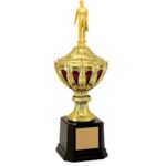Troféu com 50 cm de altura, com base com 12,1 cm de largura em polímero na cor preto. Na parte superior desta base um suporte metalizado na cor dourado e sobre este suporte uma coroa com 12 pontas com 15,1 cm de largura, com uma copa interna metalizada na cor vermelha e uma tampa metalizada na cor dourado. Estatueta intercambiável de Executivo. Demais componentes metalizados na cor dourado. Demais componentes metalizados na cor dourado.