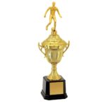 Troféu com altura de 34 cm, com base octogonal com 7,8 cm de largura em polímero na cor preta. Cone com detalhes em polímero metalizado na cor dourada, taça em polímero metalizada na cor dourada com detalhes texturizados e 10,5 cm de largura a partir das alças. Tampa em polímero metalizado na cor dourada. Estatueta intercambiável de Futebol.  Acompanha gravação personalizável em adesivo.