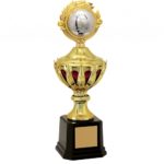 Troféu com 50 cm de altura, com base com 12,1 cm de largura em polímero na cor preto. Na parte superior desta base um suporte metalizado na cor dourado e sobre este suporte uma coroa com 12 pontas com 15,1 cm de largura, com uma copa interna metalizada na cor vermelha e uma tampa metalizada na cor dourado. Estatueta intercambiável de Ramo com Futebol. Demais componentes metalizados na cor dourado. Demais componentes metalizados na cor dourado.