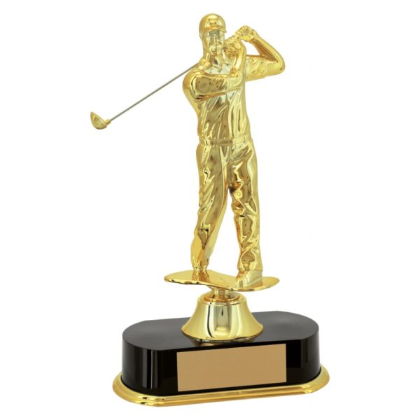 Troféu com 34 cm de altura, com base oval com 22,5 cm de largura em polímero na cor preta com friso na tampa da base metalizado na cor dourada. Na parte superior desta base um suporte em polímero metalizado na cor dourada e uma estatueta fixa de golfe metalizada na cor dourada. Acompanha gravação em adesivo.