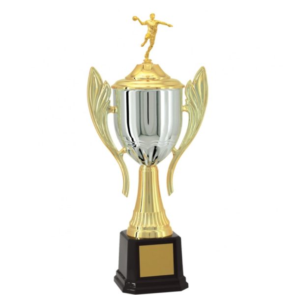 Troféu com 63 cm de altura, com base oitavada com 13,1 cm de largura em polímero na cor preta. Cone em polímero com detalhes na parte inferior metalizado na cor dourada. Copa em polímero metalizado na cor prata com 24 cm de largura entre as alças. Tampa e alças em polímero metalizado na dor dourada. Estatueta intercambiável de Handebol.