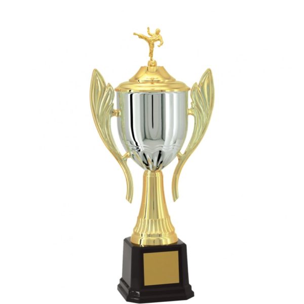 Troféu com 63 cm de altura, com base oitavada com 13,1 cm de largura em polímero na cor preta. Cone em polímero com detalhes na parte inferior metalizado na cor dourada. Copa em polímero metalizado na cor dourada com 24 cm de largura entre as alças. Tampa e alças em polímero metalizado na dor dourada. Estatueta intercambiável de Karate.