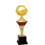 Troféu com a altura de 39 cm. Estatueta superior intercambiável. Tampa em polímero metalizada na cor dourada, cone com friso em polímero metalizado na cor dourada com coroa em polímero de 16 pontas com 9 cm de largura metalizada na cor vermelha e tampa em polímero metalizada na cor dourada.