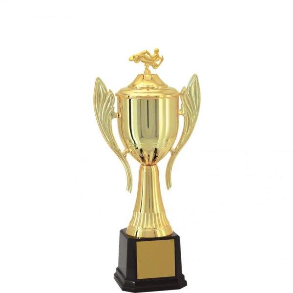 Troféu com 65 cm de altura, com base oitavada com 14,5 cm de largura em polímero na cor preta. Cone em polímero com detalhes na parte inferior metalizado na cor dourada. Copa em polímero metalizado na cor dourada com 24 cm de largura entre as alças. Tampa e alças em polímero metalizado na dor dourada. Estatueta intercambiável de Kart.