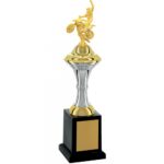 Troféu com 38 cm de altura, com base quadrada com 7,5 cm de largura em polímero na cor preta, sobre esta base dois cones com detalhes em polímero metalizado na cor prata. Sobre estes cones um suporte em polímero metalizado na cor dourada. Estatueta intercambiável de Motocross.