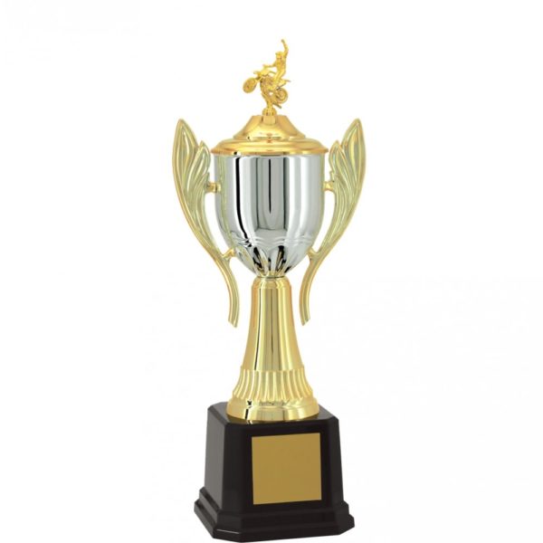 Troféu com 69 cm de altura, com base oitavada com 17,5 cm de largura em polímero na cor preta. Cone em polímero com detalhes na parte inferior metalizado na cor dourada. Copa em polímero metalizado na cor dourada com 24 cm de largura entre as alças. Tampa e alças em polímero metalizado na dor dourada. Estatueta intercambiável de Motocross.