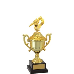 Troféu com altura de 30 cm, base quadrada com 7,5 cm de largura em polímero na cor preta. Cone com detalhes em polímero metalizado na cor dourada, taça em polímero metalizado na cor dourada com 12,5 cm de largura a partir das alças. Tampa em polímero metalizado na cor dourada. Estatueta intercambiável de Música.