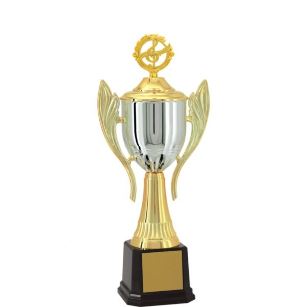 Troféu com 65 cm de altura, com base oitavada com 14,5 cm de largura em polímero na cor preta. Cone em polímero com detalhes na parte inferior metalizado na cor dourada. Copa em polímero metalizado na cor prata com 24 cm de largura entre as alças. Tampa e alças em polímero metalizado na dor dourada. Estatueta intercambiável de Ramo com Música.
