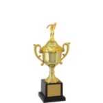 Troféu com altura de 33 cm, base quadrada com 7,5 cm de largura em polímero na cor preta. Cone com detalhes em polímero metalizado na cor dourada, taça em polímero metalizado na cor dourada com 12,5 cm de largura a partir das alças. Tampa em polímero metalizado na cor dourada. Estatueta intercambiável de Natação.