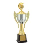 Troféu com 65 cm de altura, com base oitavada com 14,5 cm de largura em polímero na cor preta. Cone em polímero com detalhes na parte inferior metalizado na cor dourada. Copa em polímero metalizado na cor prata com 24 cm de largura entre as alças. Tampa e alças em polímero metalizado na dor dourada. Estatueta intercambiável de Ornitologia.