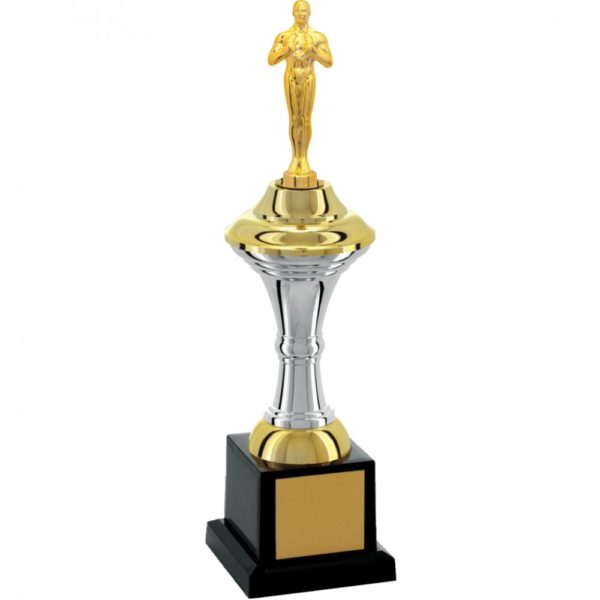 Troféu com 33 cm de altura, com base quadrada com 7,5 cm de largura em polímero na cor preta, sobre esta base um suporte e dois cones com detalhes em polímero metalizado na cor prata. Sobre estes cones um suporte em polímero metalizado na cor dourada. Estatueta intercambiável de Oscar.