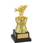 Troféu com 23 cm de altura, com base quadrada com 7,5 cm de largura em polímero na cor preta. Sobre esta base dois suportes em polímero metalizados na cor dourada, com a largura de 5,5 cm. Estatueta superior intercambiável de Peixe / Pesca.