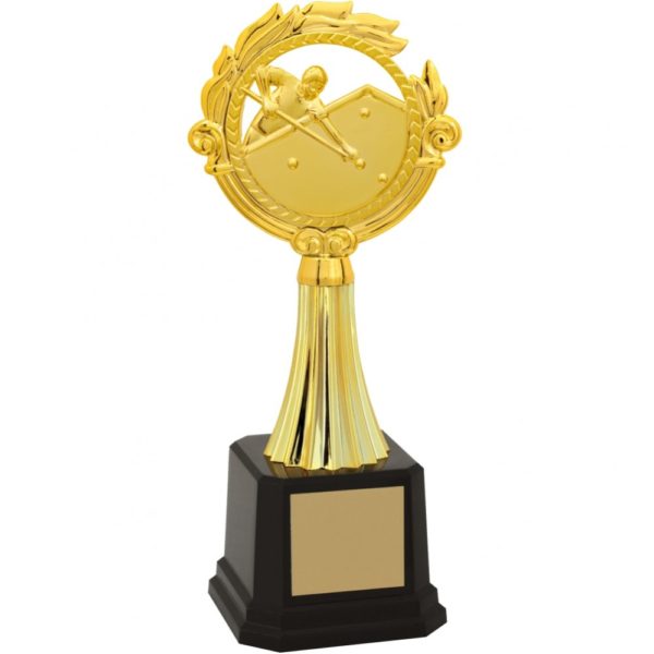 Troféu com altura de 27 cm, com base octogonal com 8,5 cm de largura em polímero na cor preta. Cone com frisos em polímero metalizado na cor dourada. Estatueta intercambiável de Ramo com SinucaAcompanha gravação personalizável em adesivo.