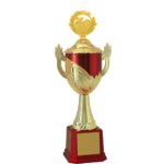 Troféu com 64 cm de altura, com base oitavada com 14,5 cm de largura em polímero metalizada na cor vermelho acetinada. Cone com detalhe na parte inferior em polímero metalizado na cor dourada e sobre este cone uma taça com 21 cm de largura a partir das alças. Esta taça é composta por cesta em polímero metalizada na cor dourada e copa em polímero metalizada na cor vermelho acetinada com tampa metalizada na cor dourada. Estatueta intercambiável de Ramo com SinucaAcompanha gravação personalizável em adesivo.