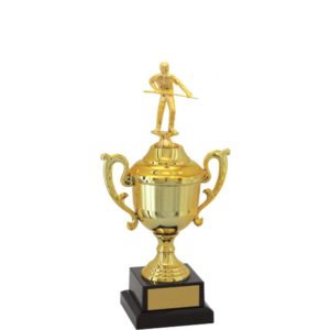 Troféu com altura de 37 cm, base quadrada com 7,5 cm de largura em polímero na cor preta. Cone com detalhes em polímero metalizado na cor dourada, taça em polímero metalizado na cor dourada com 12,5 cm de largura a partir das alças. Tampa em polímero metalizado na cor dourada. Estatueta intercambiável de Ramo com Sinuca / Snooker.