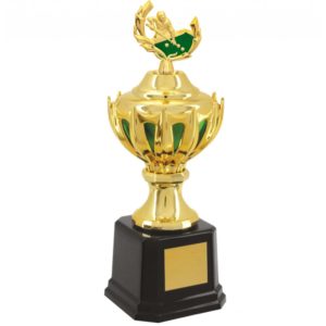 Troféu com 50 cm de altura, com base com 12,1 cm de largura em polímero na cor preto. Na parte superior desta base um suporte metalizado na cor dourado e sobre este suporte uma coroa com 12 pontas com 15,1 cm de largura, com uma copa interna metalizada na cor verde e uma tampa metalizada na cor dourado. Estatueta intercambiável de Sinuca / Snooker. Demais componentes metalizados na cor dourado. Demais componentes metalizados na cor dourado.