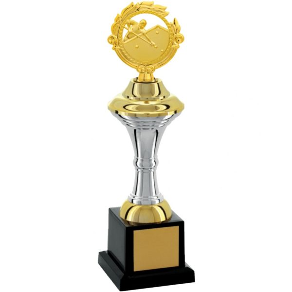 Troféu com 33 cm de altura, com base quadrada com 7,5 cm de largura em polímero na cor preta, sobre esta base um suporte e dois cones com detalhes em polímero metalizado na cor prata. Sobre estes cones um suporte em polímero metalizado na cor dourada. Estatueta intercambiável de Snooker.
