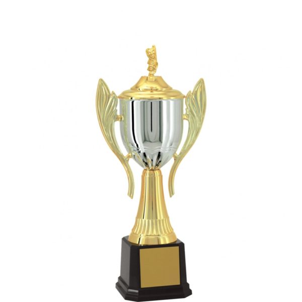 Troféu com 65 cm de altura, com base oitavada com 14,5 cm de largura em polímero na cor preta. Cone em polímero com detalhes na parte inferior metalizado na cor dourada. Copa em polímero metalizado na cor prata com 24 cm de largura entre as alças. Tampa e alças em polímero metalizado na dor dourada. Estatueta intercambiável de Teatro / Artes.