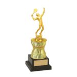 Troféu com 23 cm de altura, com base quadrada com 7,5 cm de largura em polímero na cor preta. Sobre esta base dois suportes em polímero metalizados na cor dourada, com a largura de 5,5 cm. Estatueta superior intercambiável de Tênis de Campo.