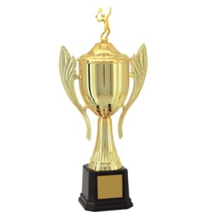 Troféu com 63 cm de altura, com base oitavada com 13,1 cm de largura em polímero na cor preta. Cone em polímero com detalhes na parte inferior metalizado na cor dourada. Copa em polímero metalizado na cor dourada com 24 cm de largura entre as alças. Tampa e alças em polímero metalizado na dor dourada. Estatueta intercambiável de Tênis de Campo.