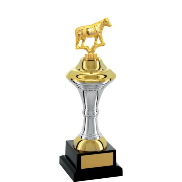 Troféu com 31 cm de altura, com base quadrada com 7,5 cm de largura em polímero na cor preta, sobre esta base um suporte e dois cones com detalhes em polímero metalizado na cor prata. Sobre estes cones um suporte em polímero metalizado na cor dourada. Estatueta intercambiável Vaca.